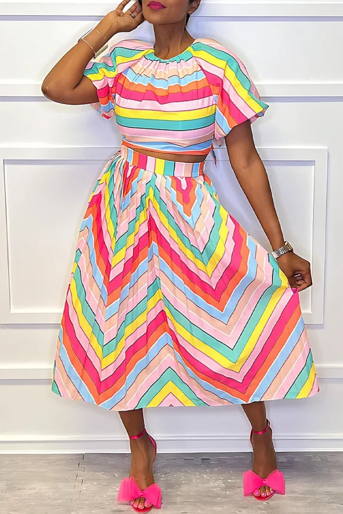 This playful rainbow striped two-piece features a crop top with gathered neckline and flutter sleeves paired with a high-waisted midi skirt in coordinating chevron pattern.