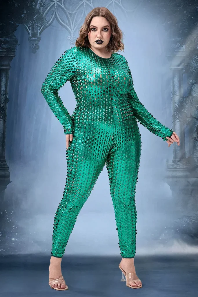 You’ll transform into an absolutely stunning sea goddess with this head-to-toe emerald green sequined jumpsuit. The shimmery scales catch light beautifully from every angle.