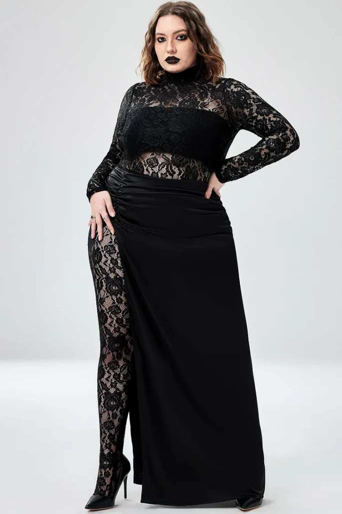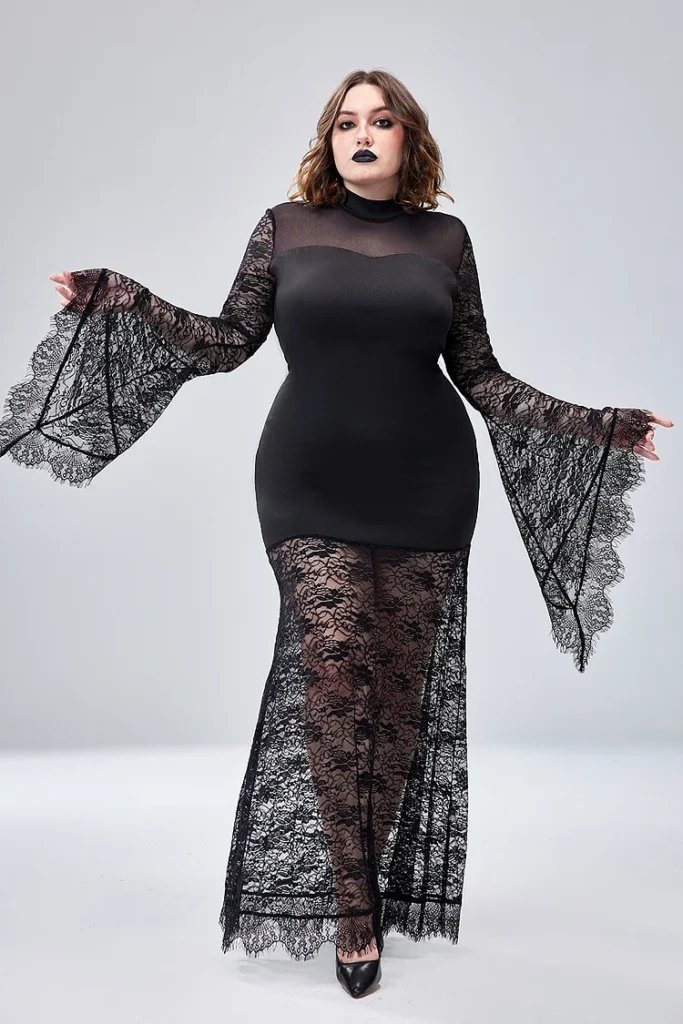 You’ll channel mysterious elegance in this stunning gothic ensemble that perfectly balances sultry and sophisticated. The intricate black lace creates beautiful texture while the high neckline adds dramatic flair.
