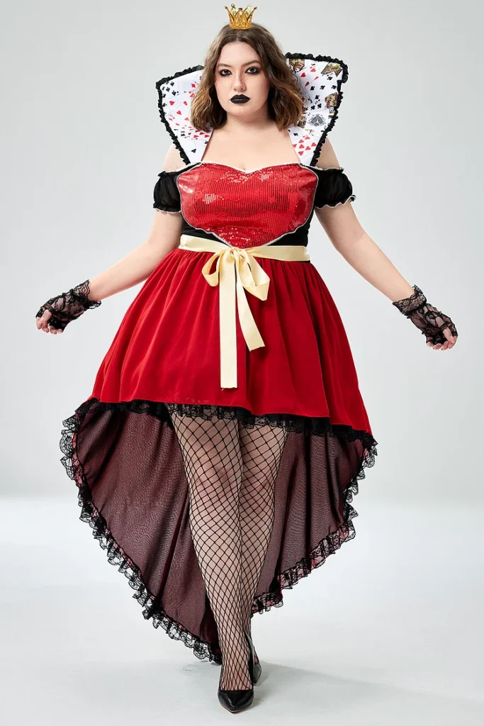 The high-low skirt with lace trim adds movement and drama to your royal presence. A golden crown completes your transformation into Alice’s most memorable antagonist.
