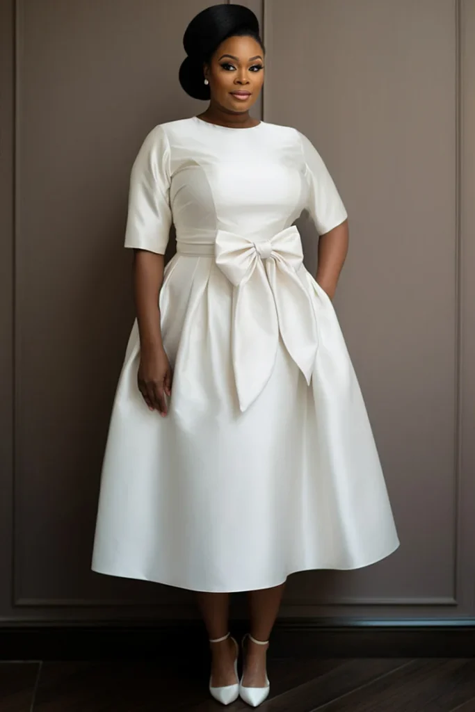 7. Elegant Simplicity: A-Line Tea-Length Wedding Dress with Bow Detail