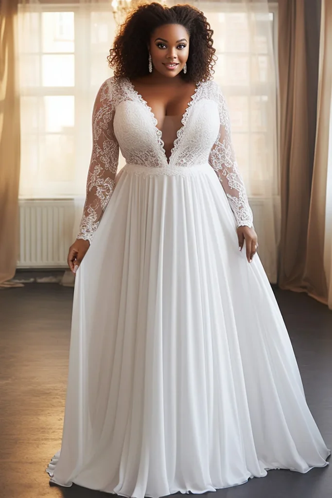 The plunging V-neckline framed by scalloped lace creates a beautifully flattering focal point. Delicate illusion sleeves with intricate lace patterns offer graceful coverage while still showcasing your skin.