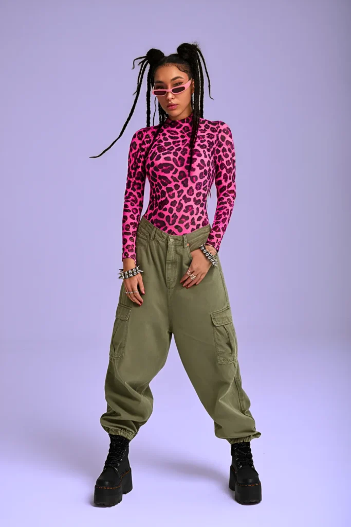 Make a bold statement in a neon pink cheetah print bodysuit tucked into baggy olive green cargo pants.